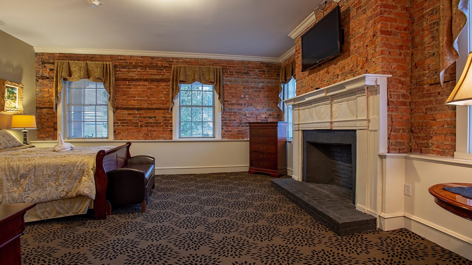 Bedroom with brick walls and television above fireplace