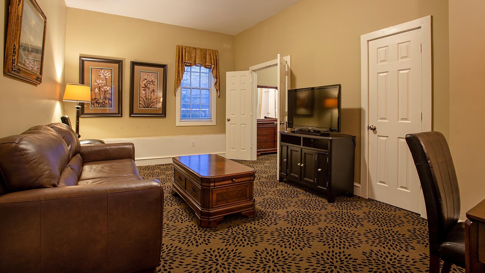 Living room with beige walls, brown leather couch and coffee table